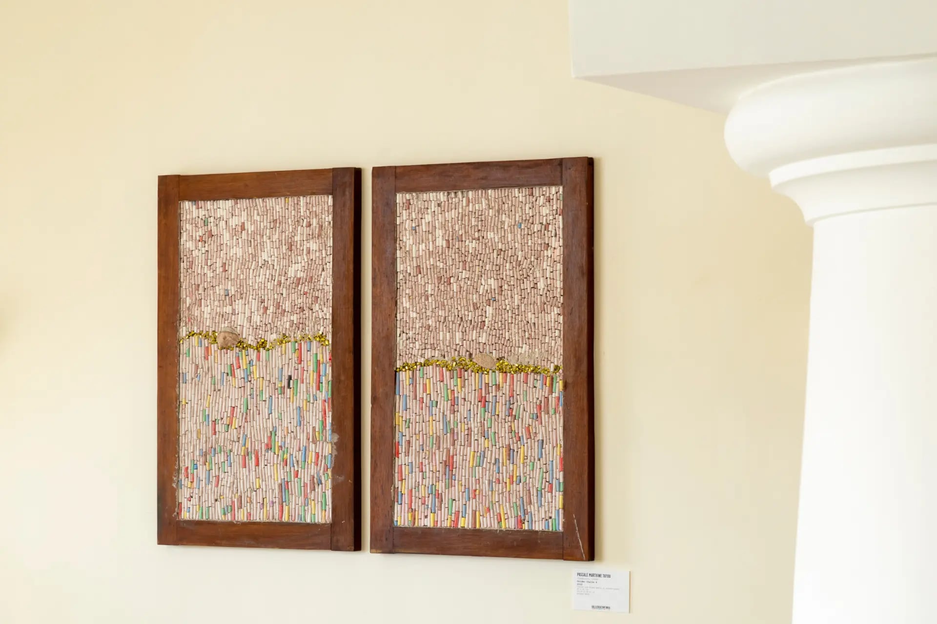 Il colore vibrante che ammiriamo nelle opere di Cecchini si ritrova nelle creazioni di Pascale Marthine Tayou. Utilizzando materiali riciclati e di recupero, le sue opere “Golden Chalks B” e “Colorful Stones” rivitalizzano simboli archetipici attraverso un linguaggio contemporaneo. Qui il colore è memoria, materia e significato – frammenti di un mondo idealizzato carico di allegoria, trasformati in un linguaggio visivo di speranza e ibridità.